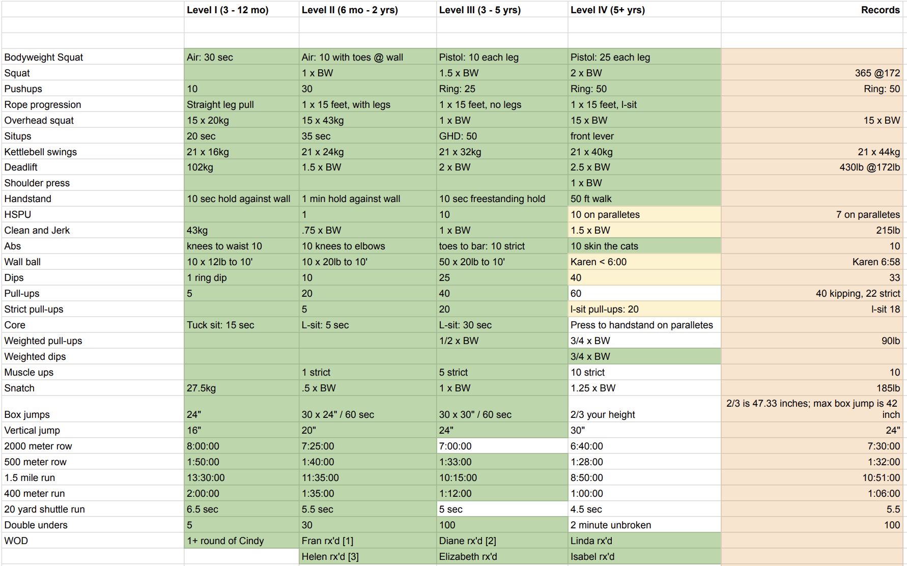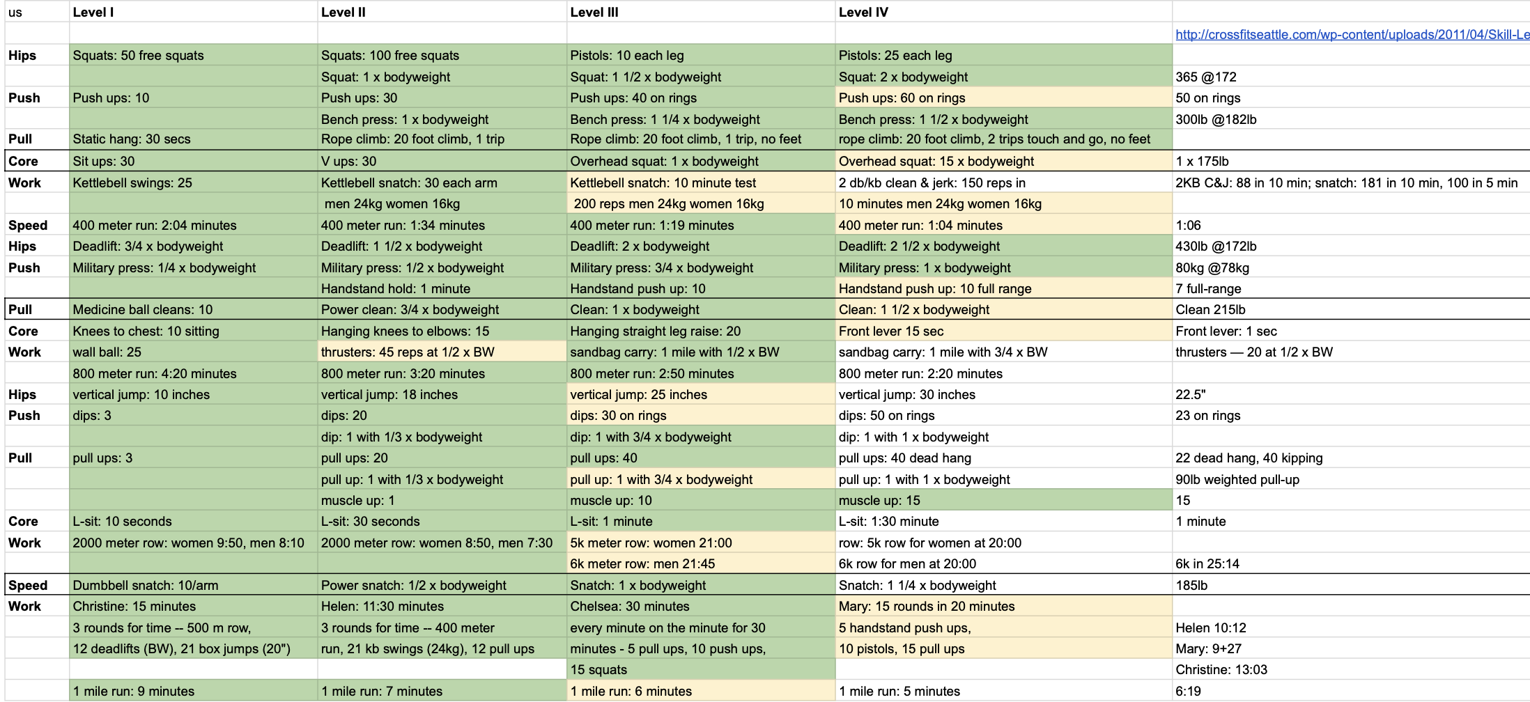 In my fitness circles, CrossFit was still criticized for its reckless high-skill olympic movements performed at high intensity. Blame the epic fail videos of someone doing something stupid and the ignorance around the methodology. While I was on the offense about doing actual CrossFit, I loved the “variable movements” concept. I found a couple of “crossfit athlete standards” posters online and made this spreadsheet to track my progress across multiple domains. It immediately exposed all my gaps: I could squat 2x bodyweight but my snatch was at a measly 100lb and all the speed and work capacity tests were barely at level 2: