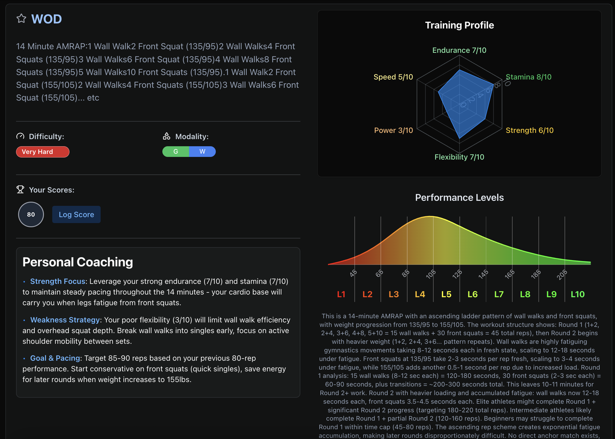 The end result is incredible. We’re able to turn a textual mess like this, into an actual workout and your actual performance. Here we see that 14min AMRAP was properly parsed into movements like “Wall Walk” and “Front Squat”; that it’s an endurance and stamina -heavy workout (yep!), that it’s classified as “Very Hard” and its modality are equally “Gymnastics” and “Weighlifting”. Moreover, AI determined that user’s score of 80 falls right around L3 (which we would likely adjust to L3.5 or L4 due to workout’s difficulty):
