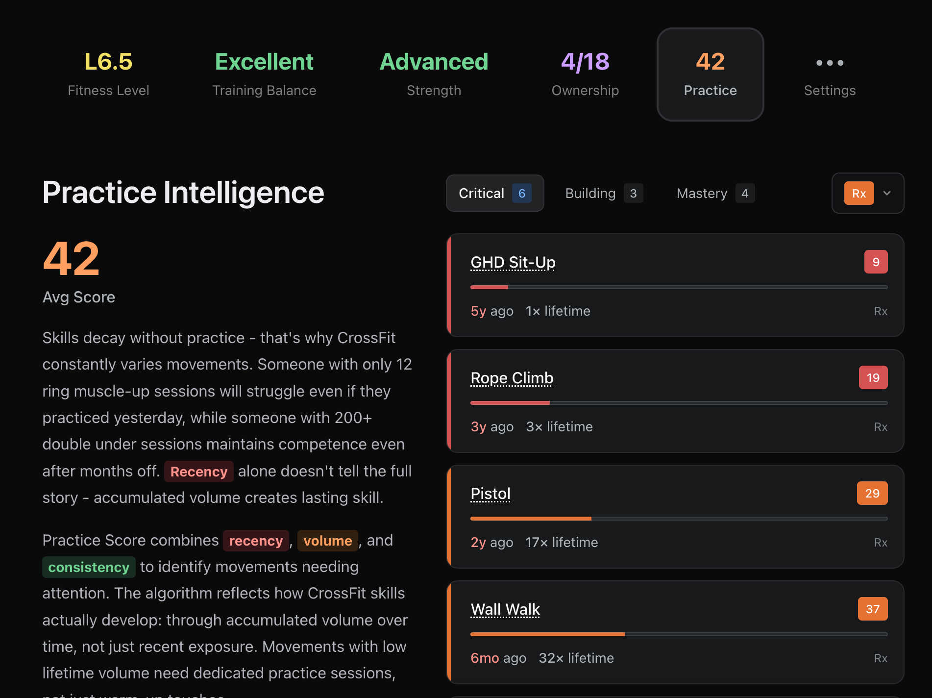 Parsing “Wall Walk” as a movement is what allows us to count that towards your practice score! Notice that we now know that you’ve done “Wall Walk” 32 times in your life with the recent one being 6 months ago.