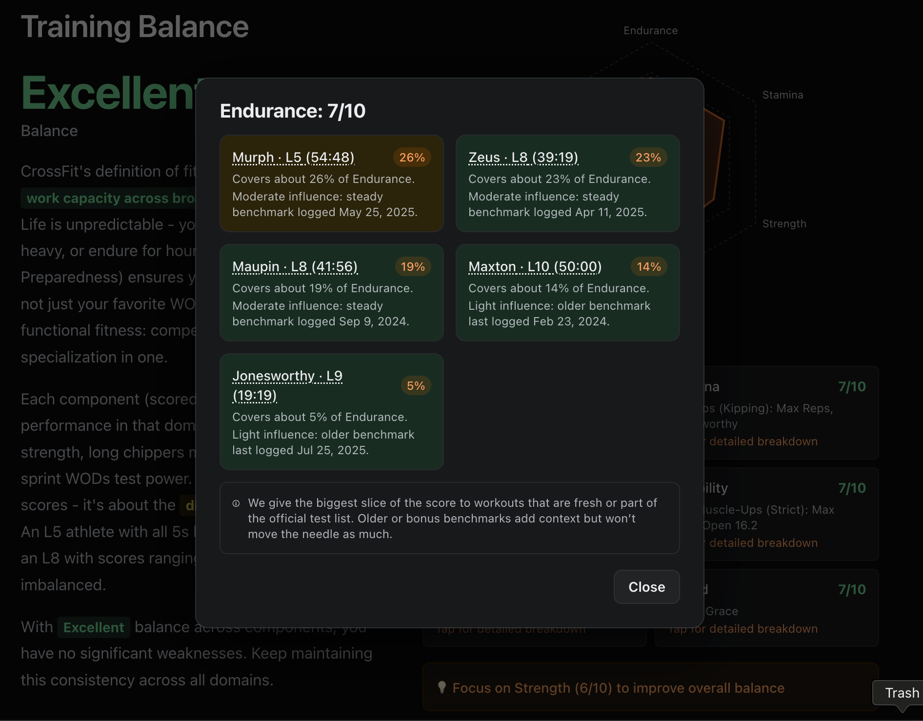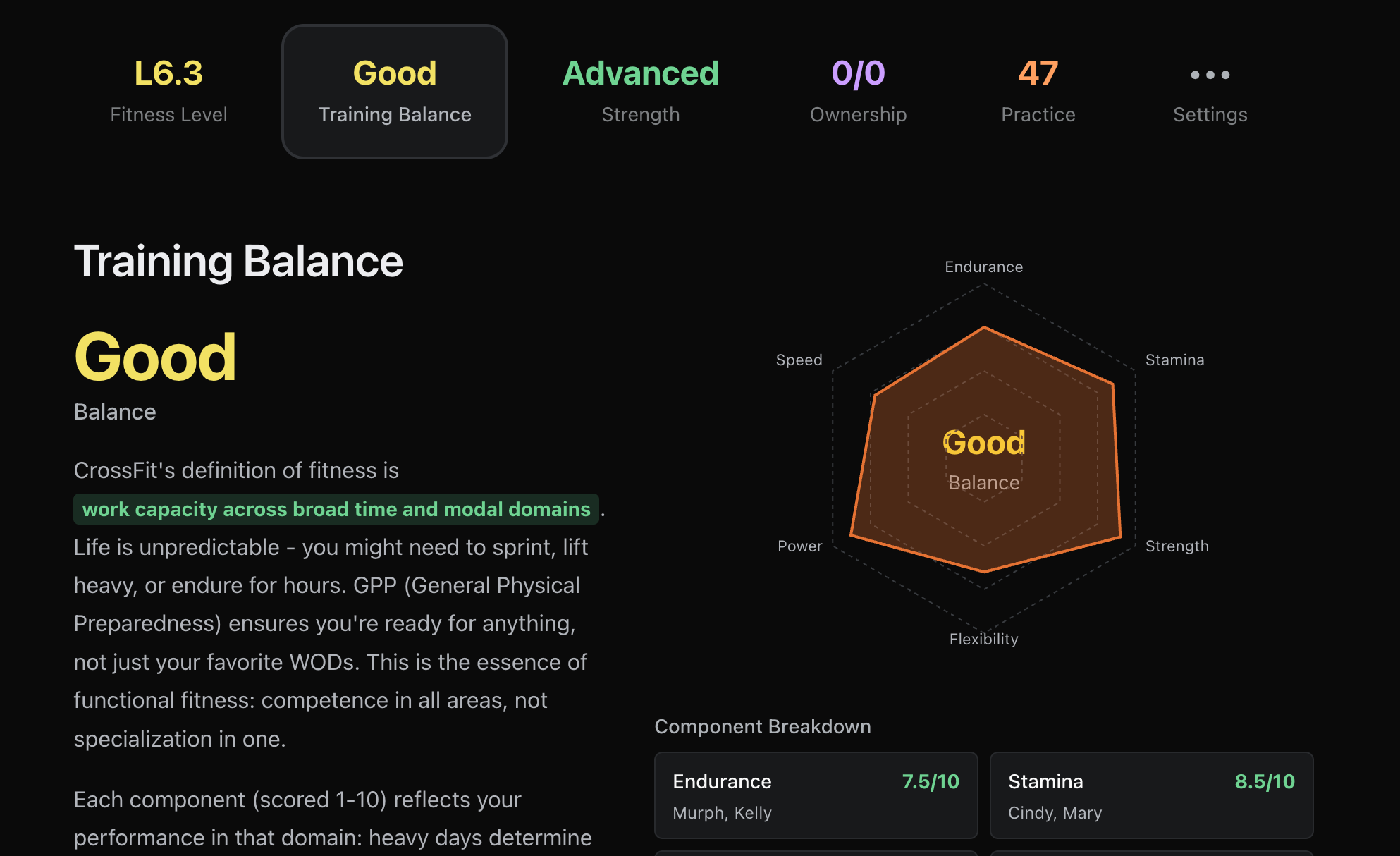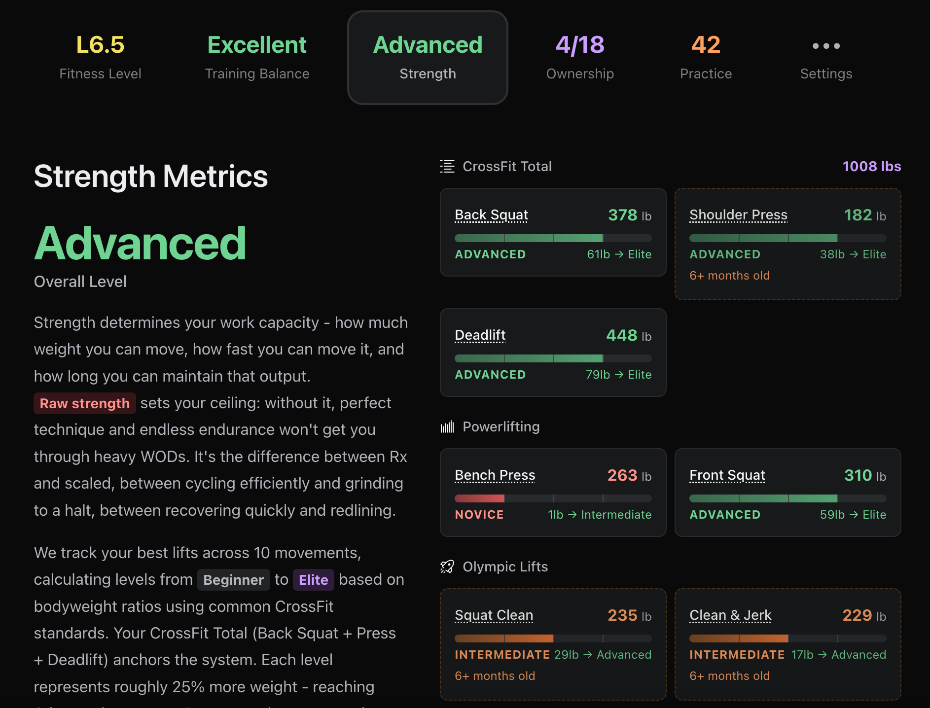 And so I turned all my spreadsheets into a simple snapshot consisting of 5 views: your level, balance, strength, ownership, and practice. These could be easily extended in the future with any other modules: time domain distribution, specific goals tracking like work capacity or endurance. Or even sport-specific ones like Hyrox.