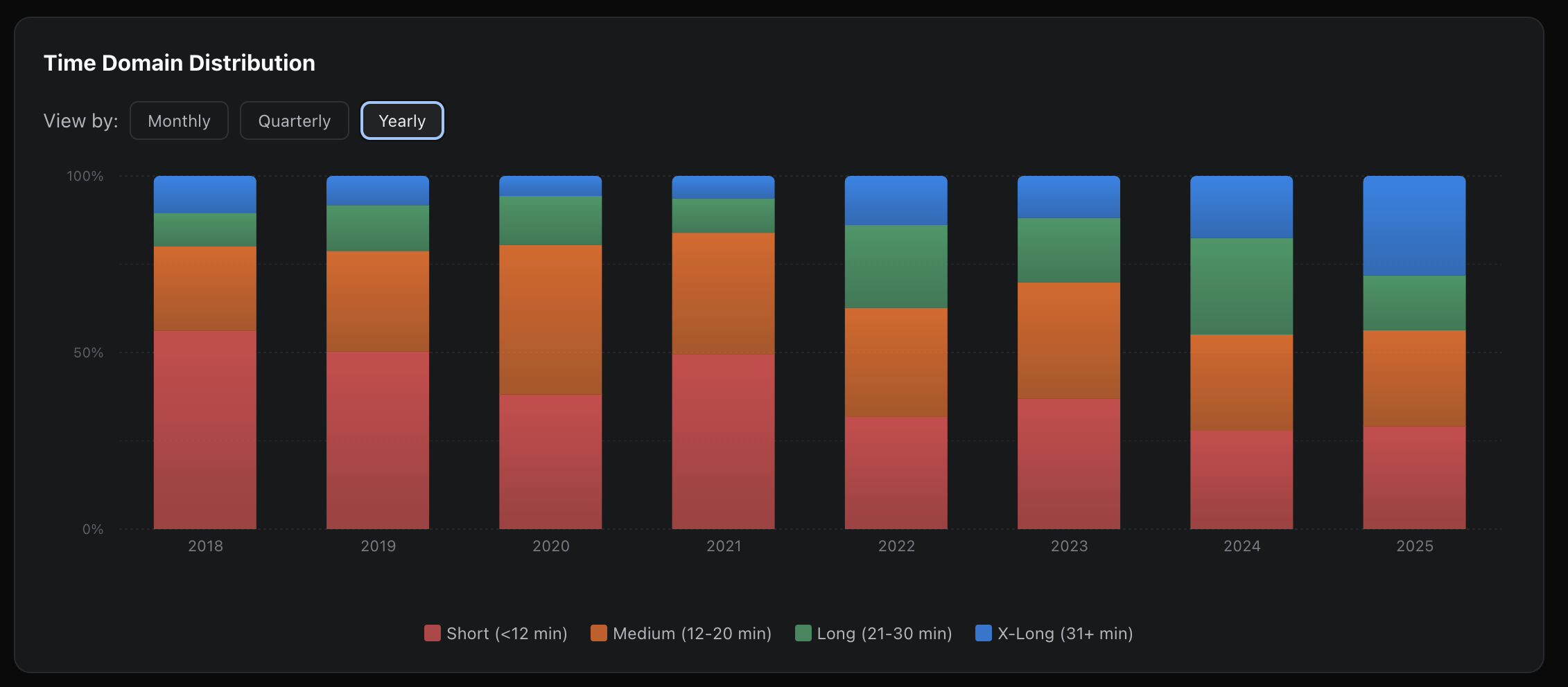 Because we’ve determined time domain of all the wods you’ve ever done, we can show if you’re leaning towards shorter or longer ones. Yes, parsing 1300 entries is expensive but at least we can marvel at the end result 😅. Here is coach Mike’s real data dating back to 2018. You can see that early years prioritize short WODs (<12min) whereas last couple years the focus has shifted towards longer, HYROX-style ones: