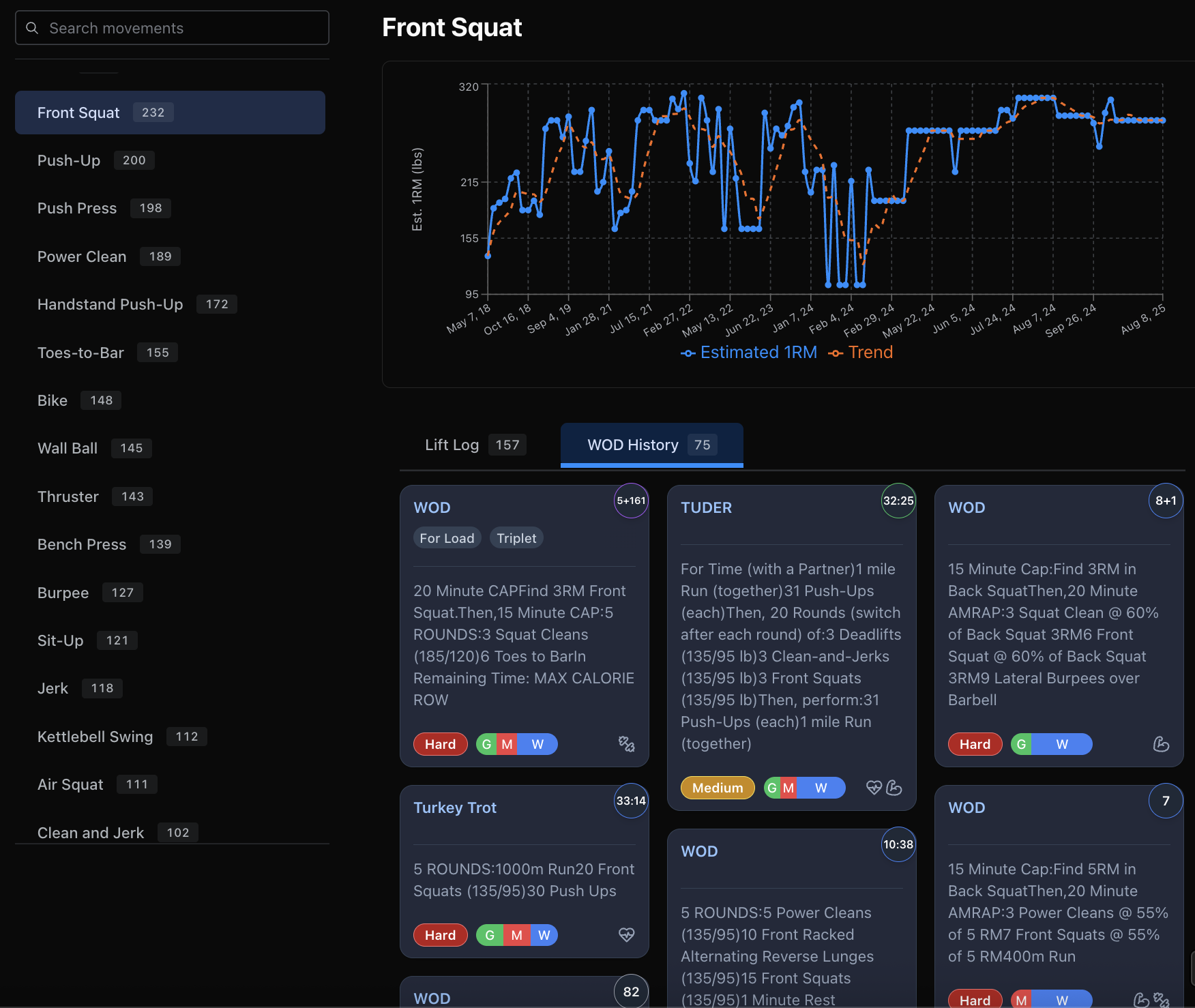 And, of course, we have ability to see all the WODs for any given movement (why it’s so important to parse those for all the custom WODs and create proper associations). Here you can see that Mike has done over 232 lifetime front squat sessions over 8 years, 157 as dedicated lifts and 75 as part of WODs:
