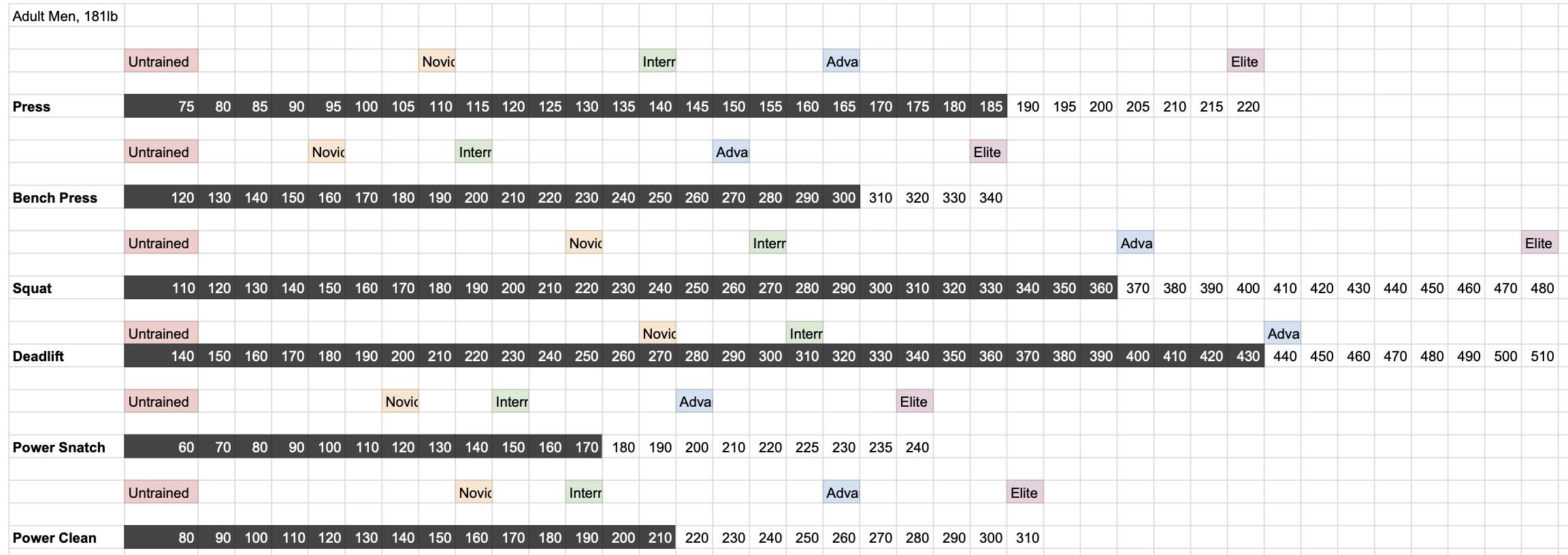 The spreadsheet overload was real. This wasn’t the first one I used. As far back as 2011, I found exrx.net Strength Standards and created this view to understand where I stand strength-wise and what to work on: