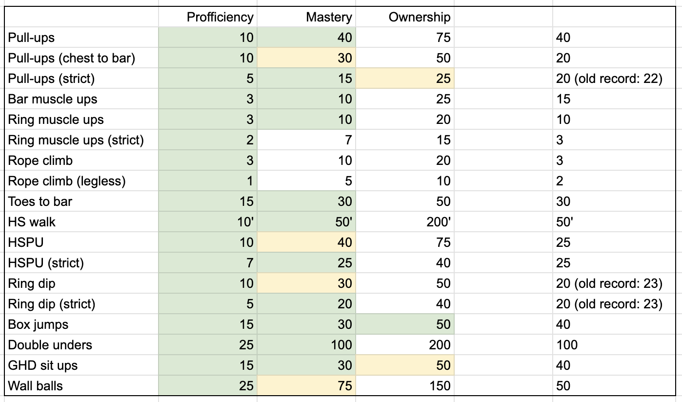 Finally, I tracked my proficiency levels on various CrossFit -specific movements as a way to advance my skill and become fluent in them during WOD’s.