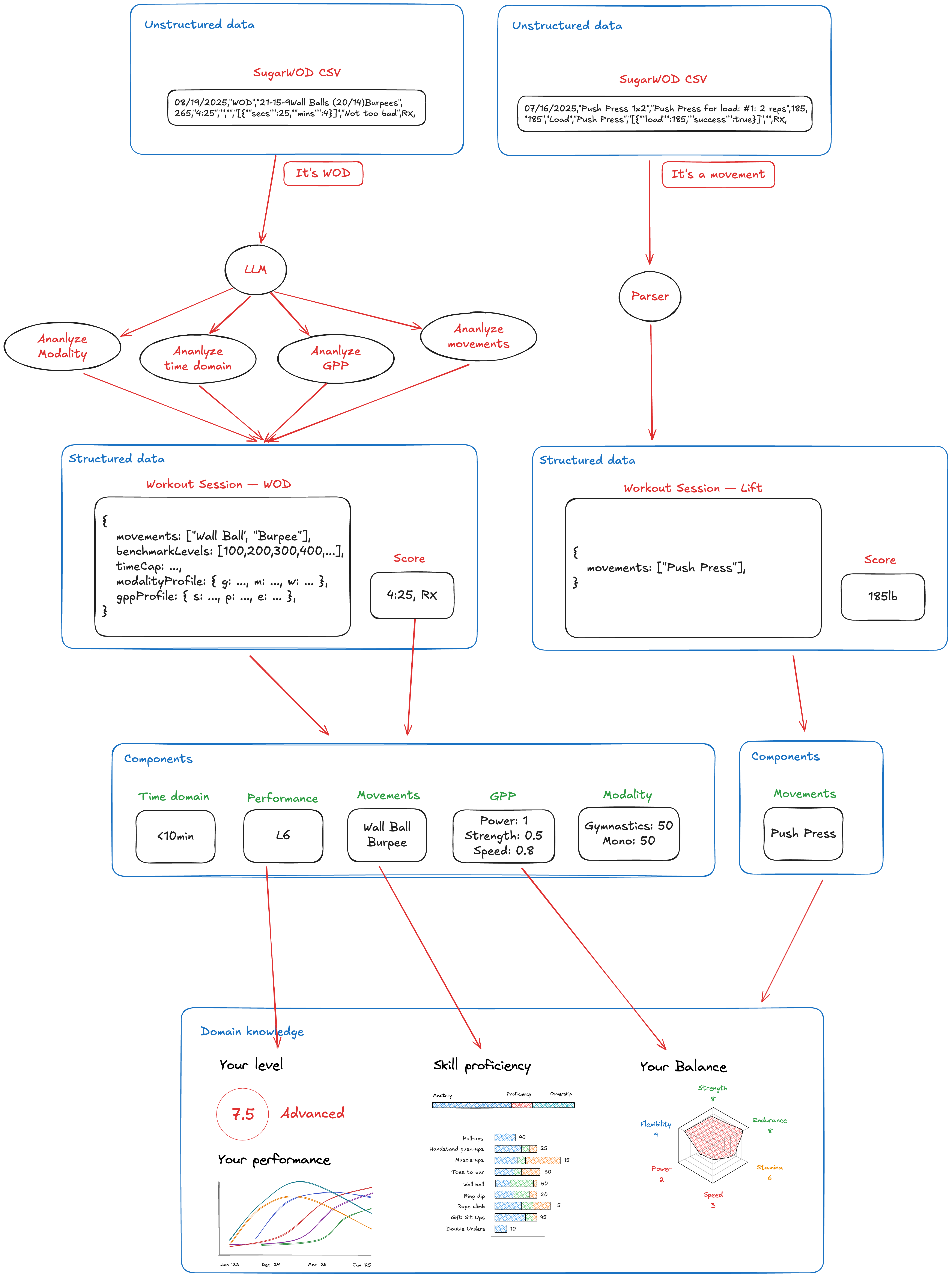 I then switched to a series of small, targeted LLM parsers/prompts—as seen on the diagram above—for each of the metrics and ran them in parallel. The results were astonishing: faster and cheaper execution and much more accurate results. This also gave me flexibility to run only specific parsers in specific cases; e.g. when parsing your historic data we want to extract movements (to feed it into our proficiency metrics), performance levels (to understand how your fitness level progressed), time domain (to see a time domain breakdown), and so on. We don’t care about coaching/scaling/stimulus module since the workouts are in the past and users don’t need to know that! However, those modules are important for new workouts, when using analyze or generate.